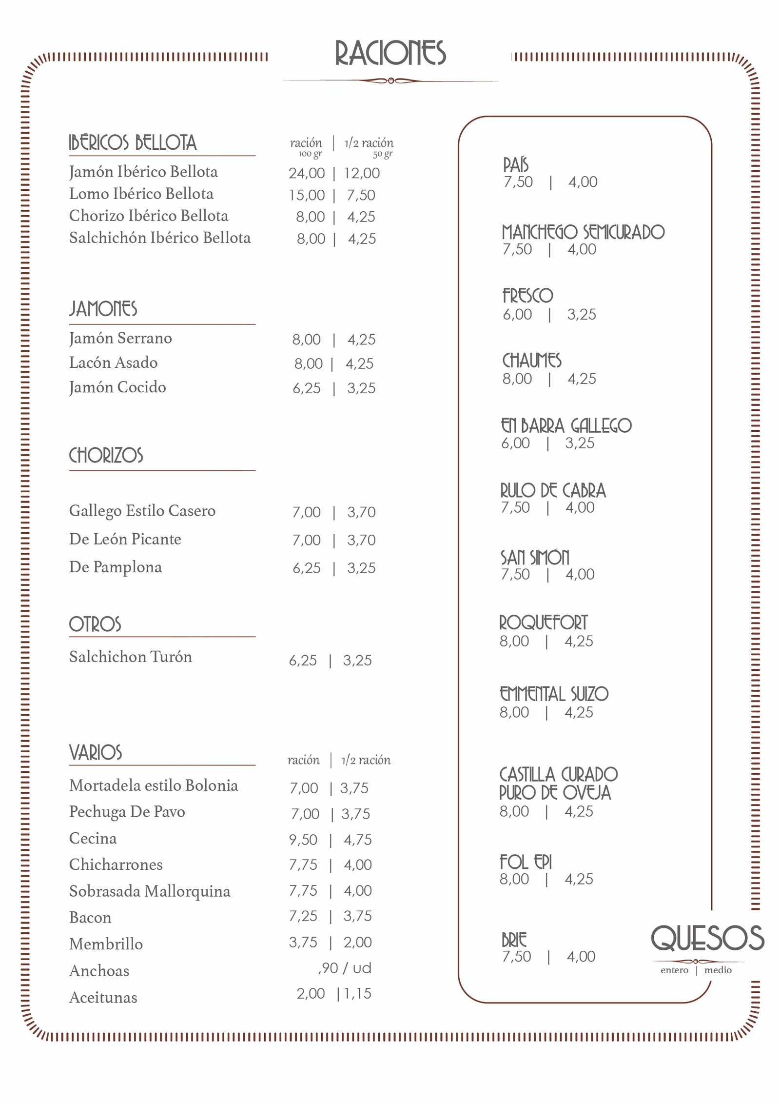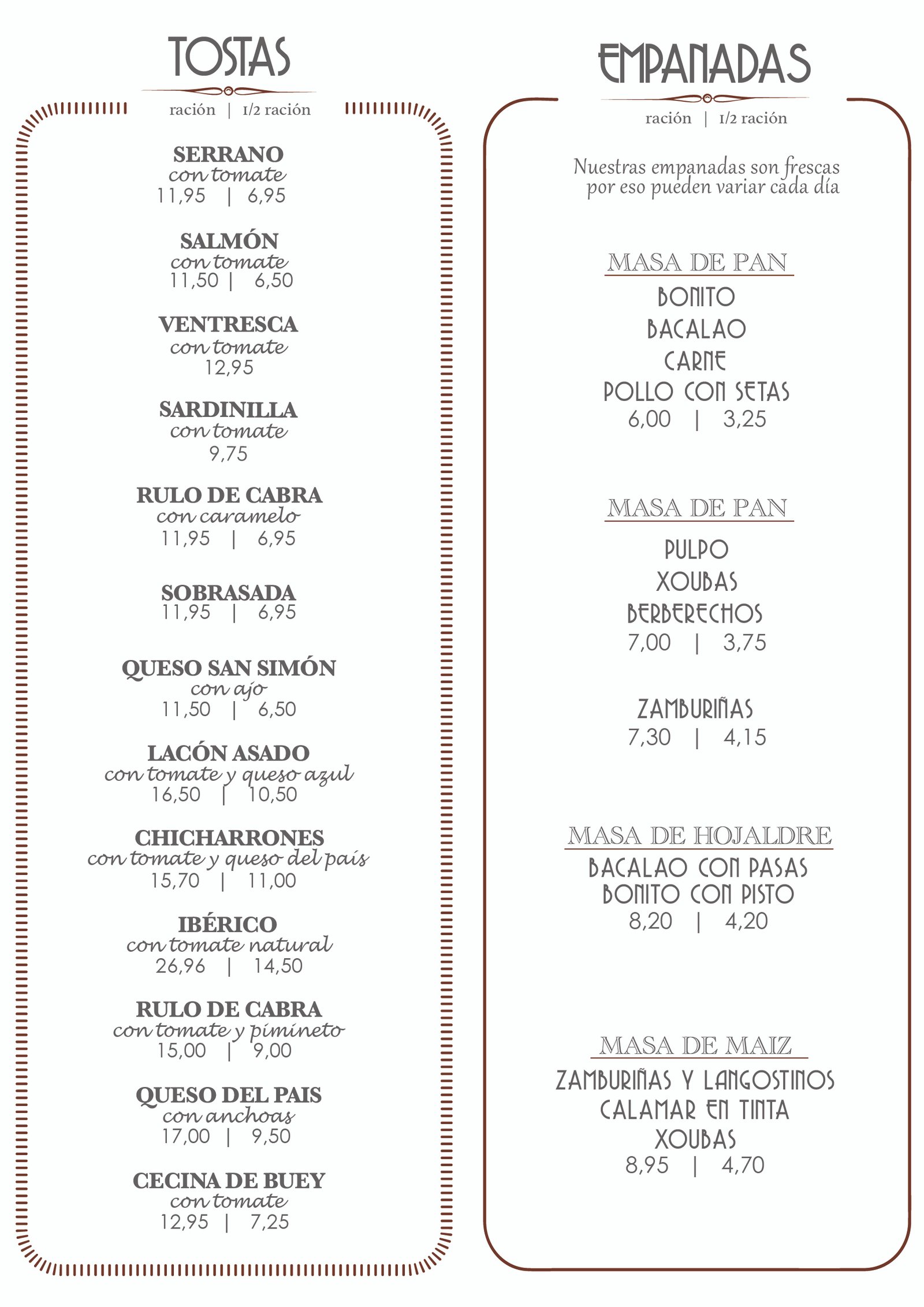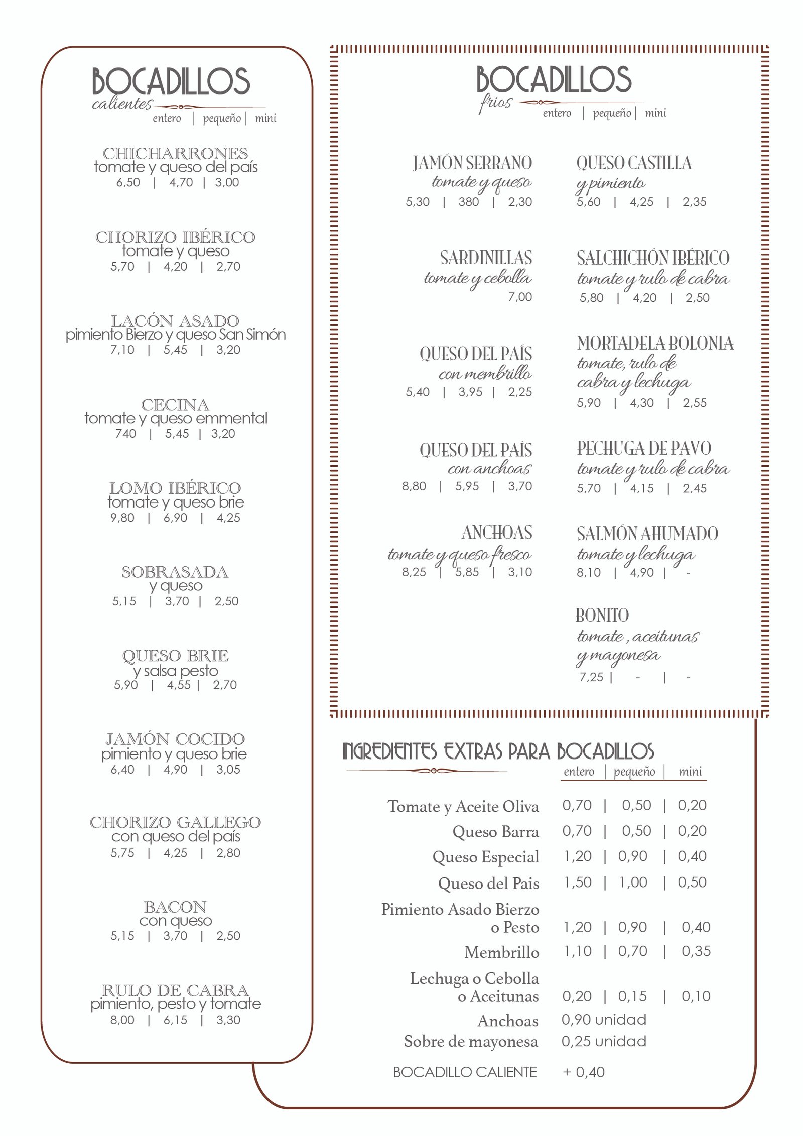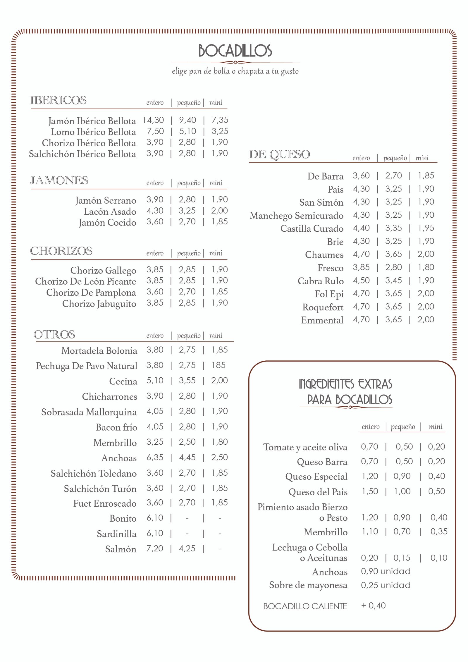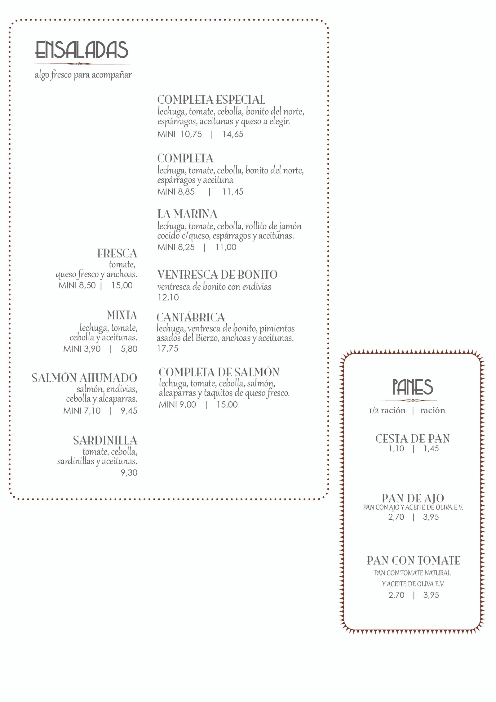 Carta Jamoneria La Marina TOSTAS BOCADILLOS BOCADILLOS 2 ENSALADA RACIONES TABLAS BEBIDAS POSTRES VINO * Estos precios son para consumo dentro del local *